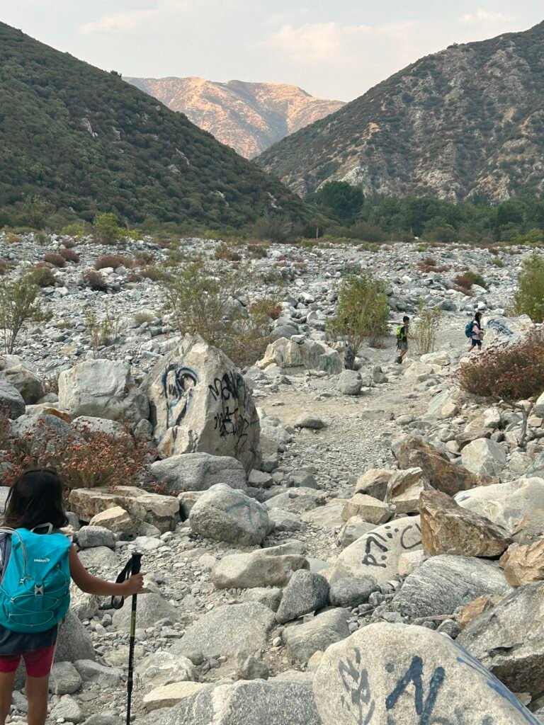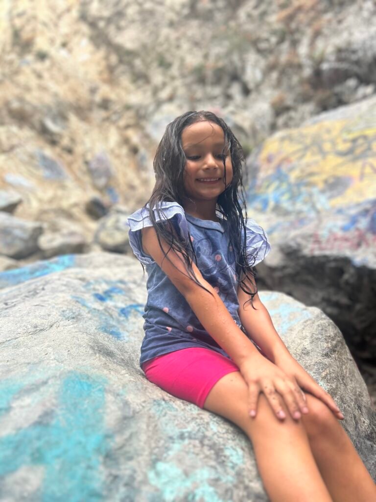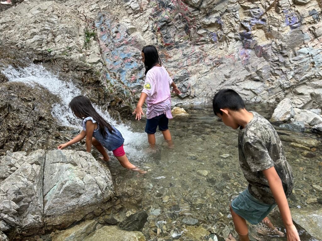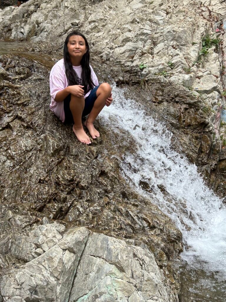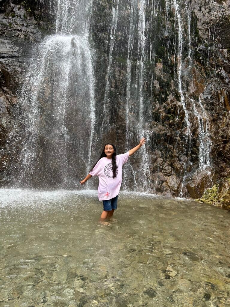 Only a 15 minute hike through a semi unmarked trail leads you to a spectacular shaded canyon with a stream full of knee to waist deep pools, all lining the path up to this beautiful tall and refreshing waterfall. The walls of the water fall are a gorgeous emerald green lined with mosses and ferns.